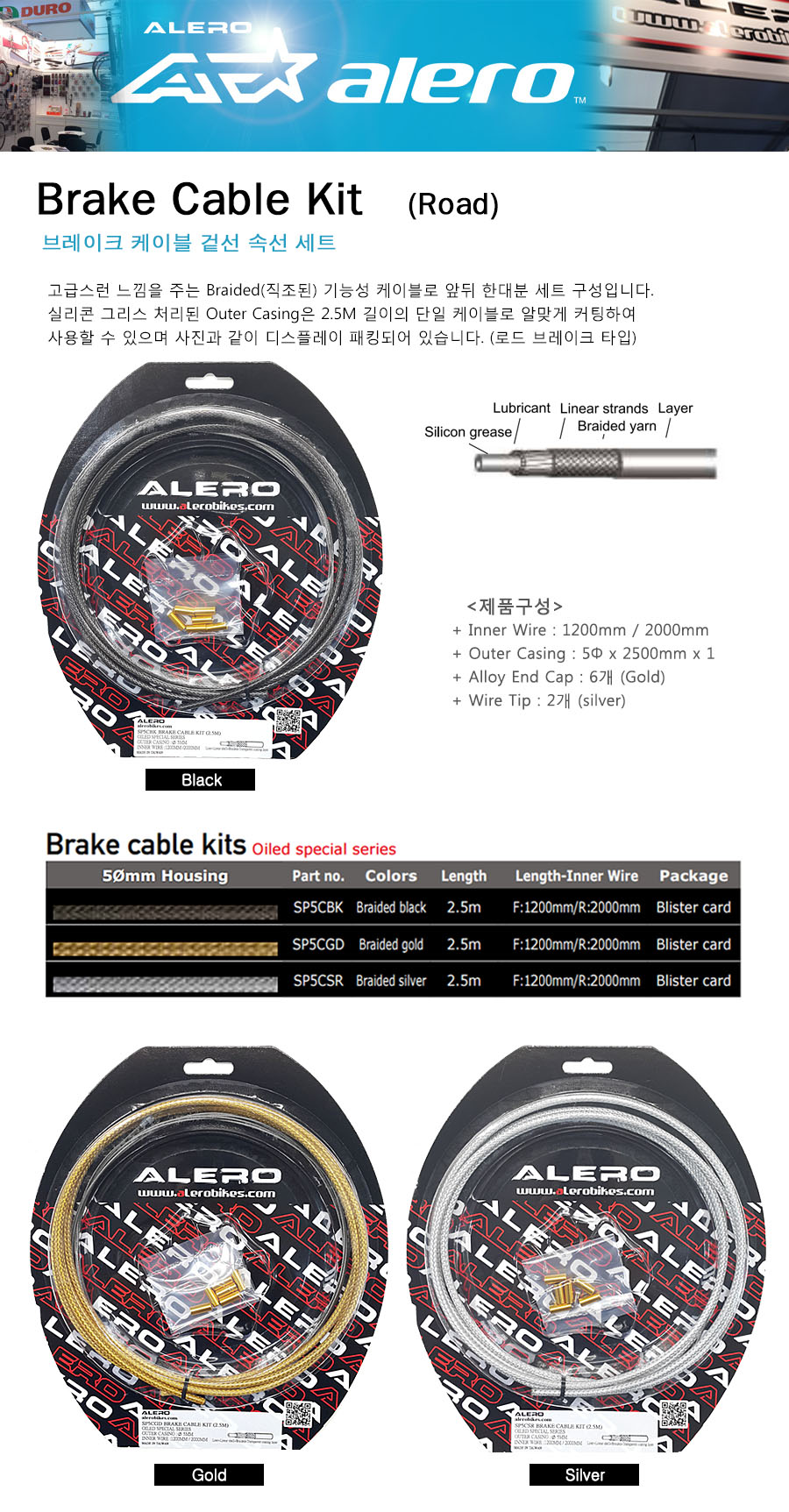 ALERO ºê·¹ÀÌÅ© ÄÉÀÌºí ¼¼Æ® (Road) °íǰÁú Brake Cable Kits (Dia:5mm / L:250mm / Wire F:1000/R1700mm)