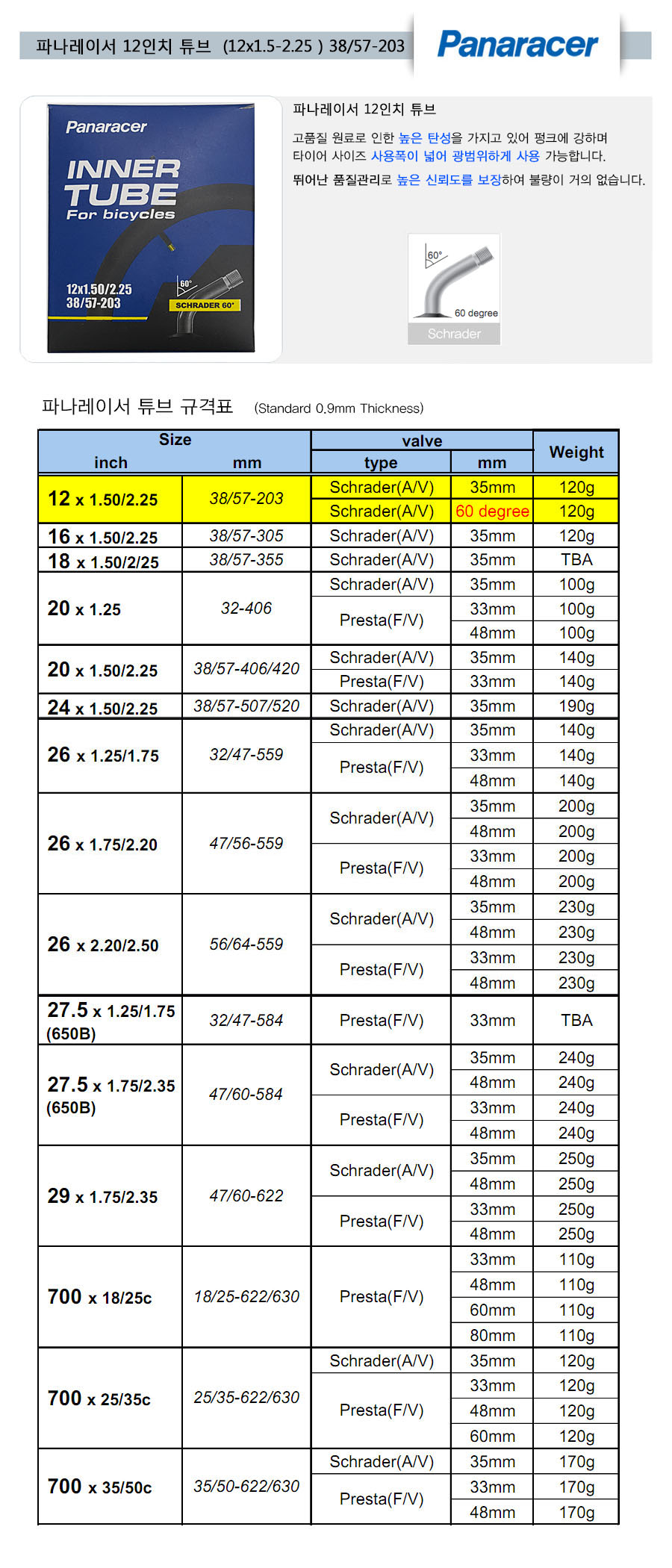 (NEW) ÆÄ³ª·¹À̼­ 12ÀÎÄ¡ Æ©ºê (Schrader 60¨¬) Panaracer Tube 12x1.5-2.25 (38/57-203) Á¤Âû°¡